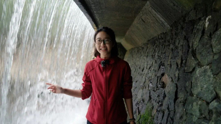 此刻手机没有任何信号,只能静下心来感受瀑布带来的那份小小震撼。从岩壁垂落的水幕被气流带起,斜斜的水雾润湿了空气,也微微打湿了头发。瀑布下是一汪积水形成的水潭,薄荷色的水冰凉醒神,晃荡着从小小的缺口溢出,流过渠道,淌过菖蒲,流向山下的土地。